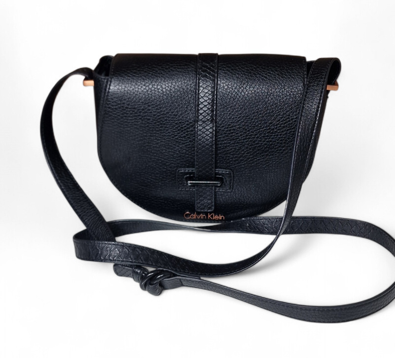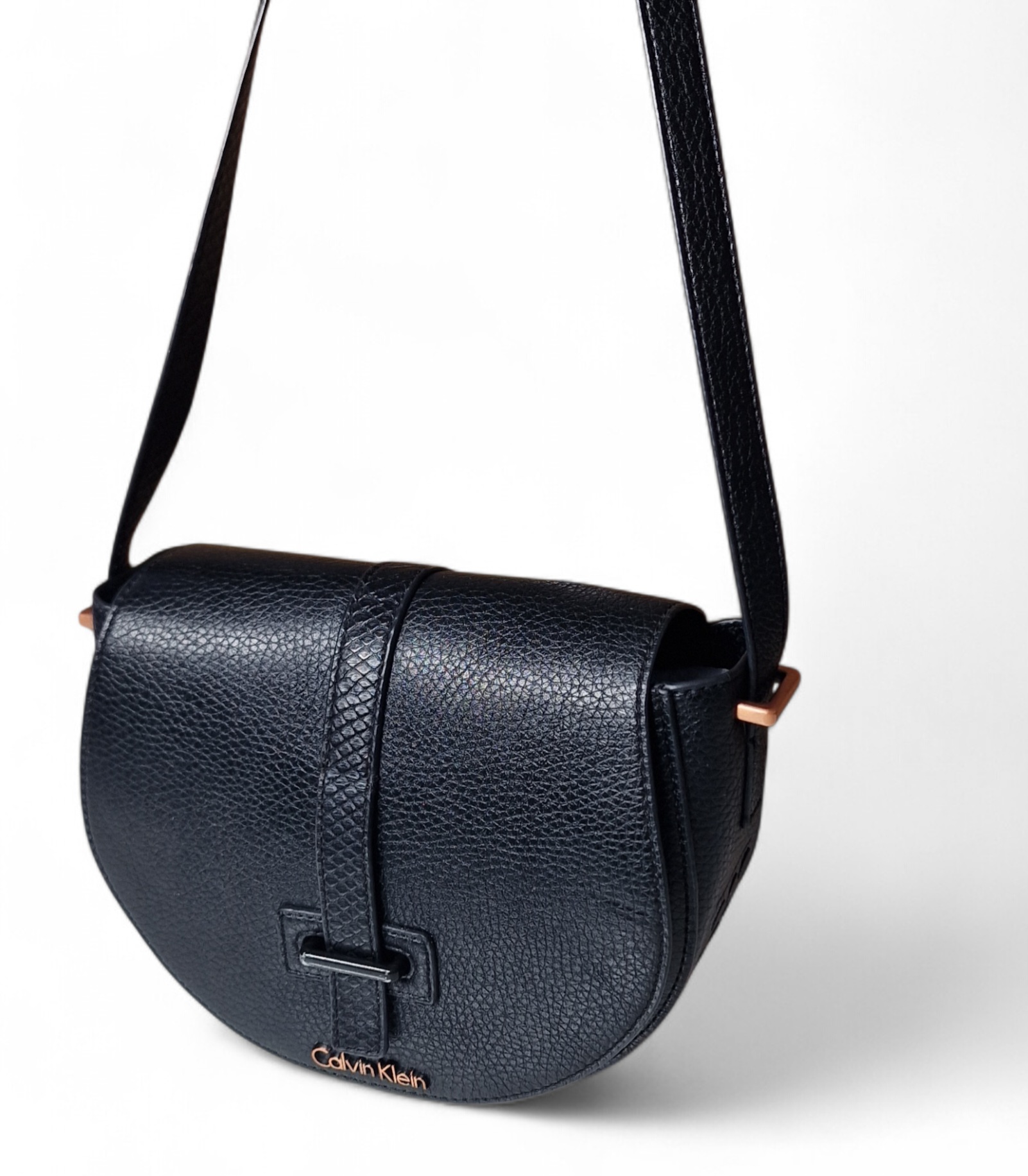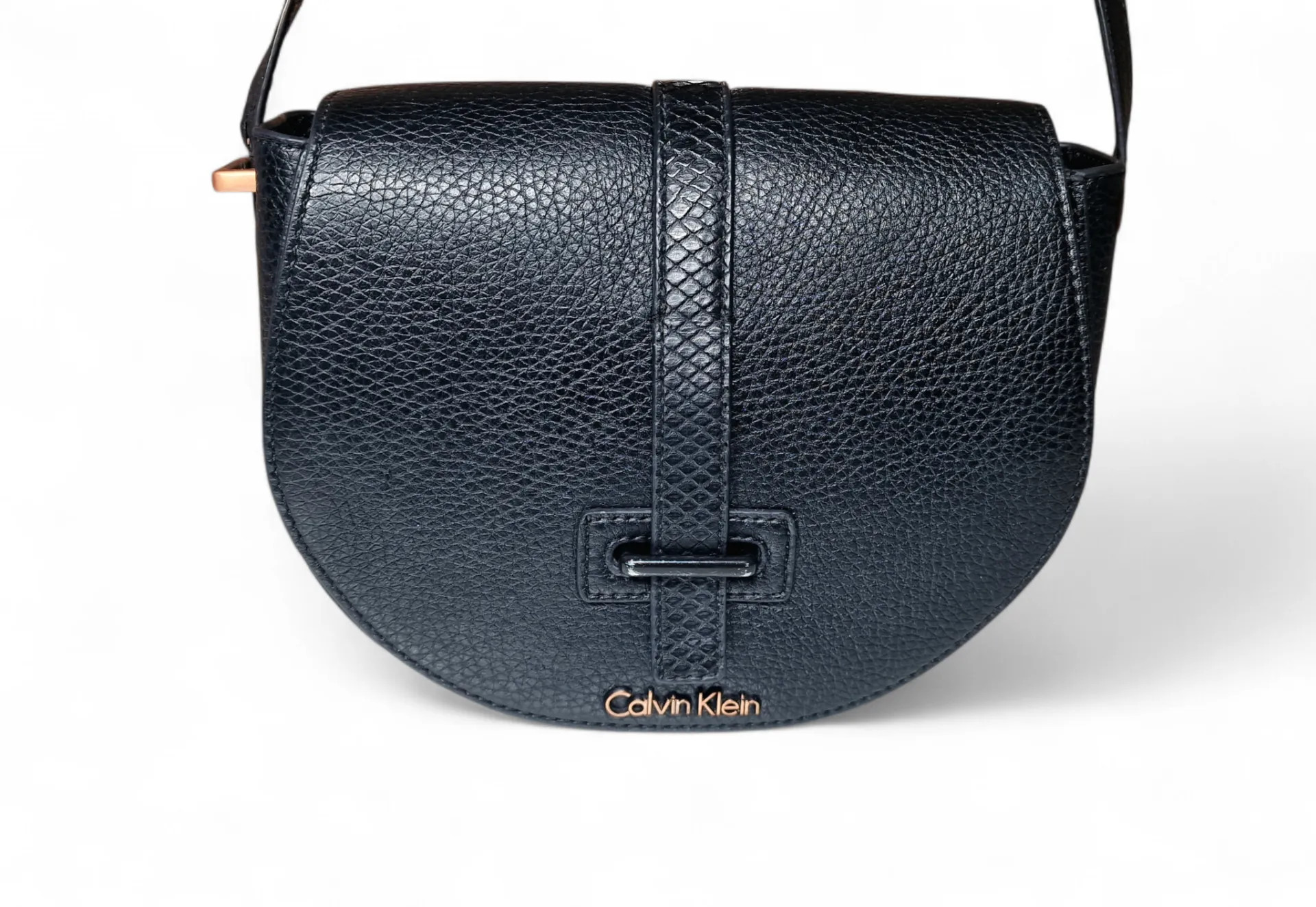 Elegáns, félhold fazonú CK táska arany logóval és karakteres díszítéssel az alján.