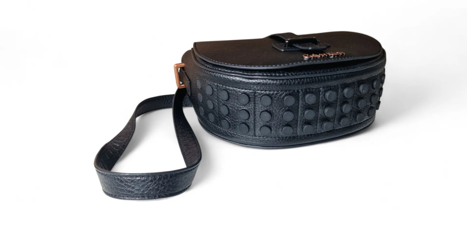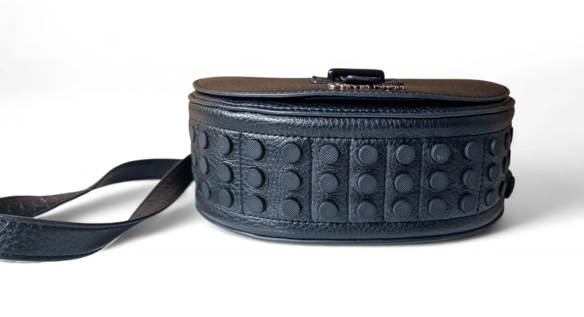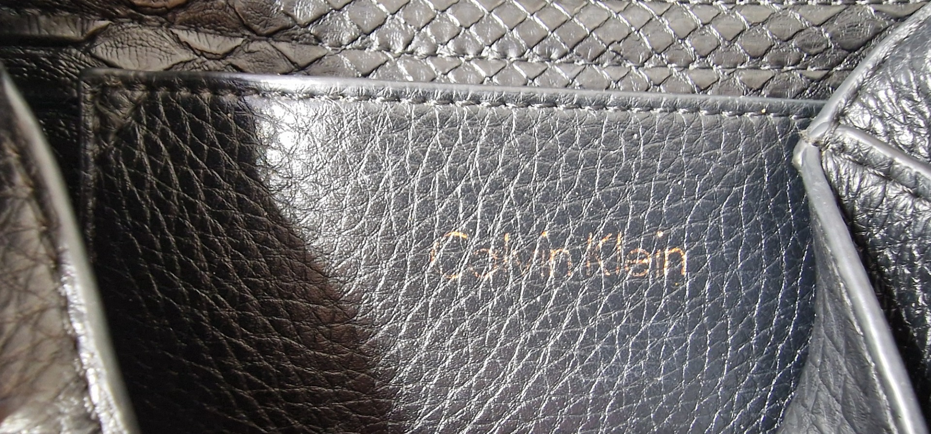 Elegáns, félhold fazonú CK táska arany logóval és karakteres díszítéssel az alján.