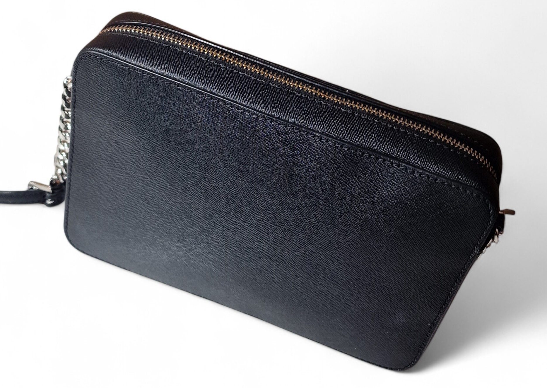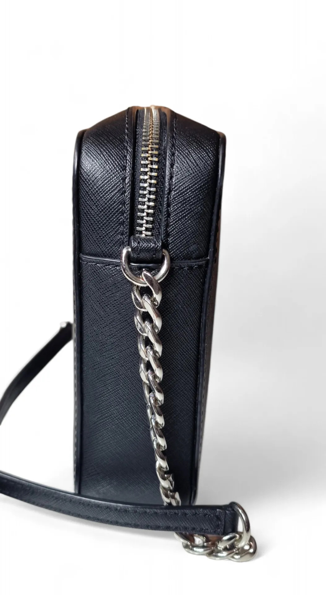 Fekete, ezüst színű láncos pánt, praktikus cipzáras kialakítás.